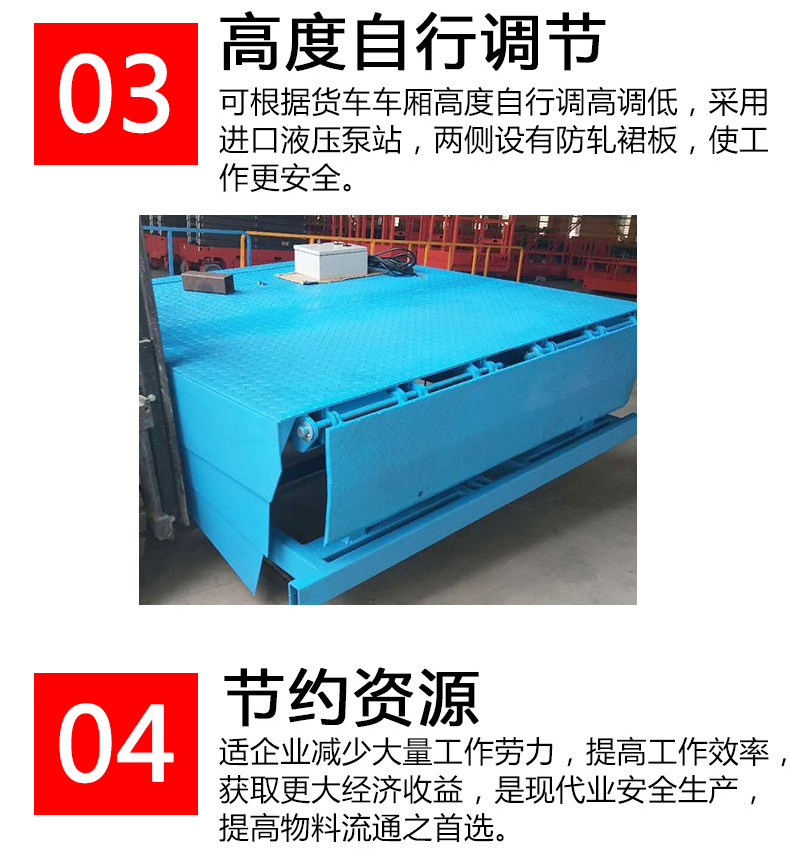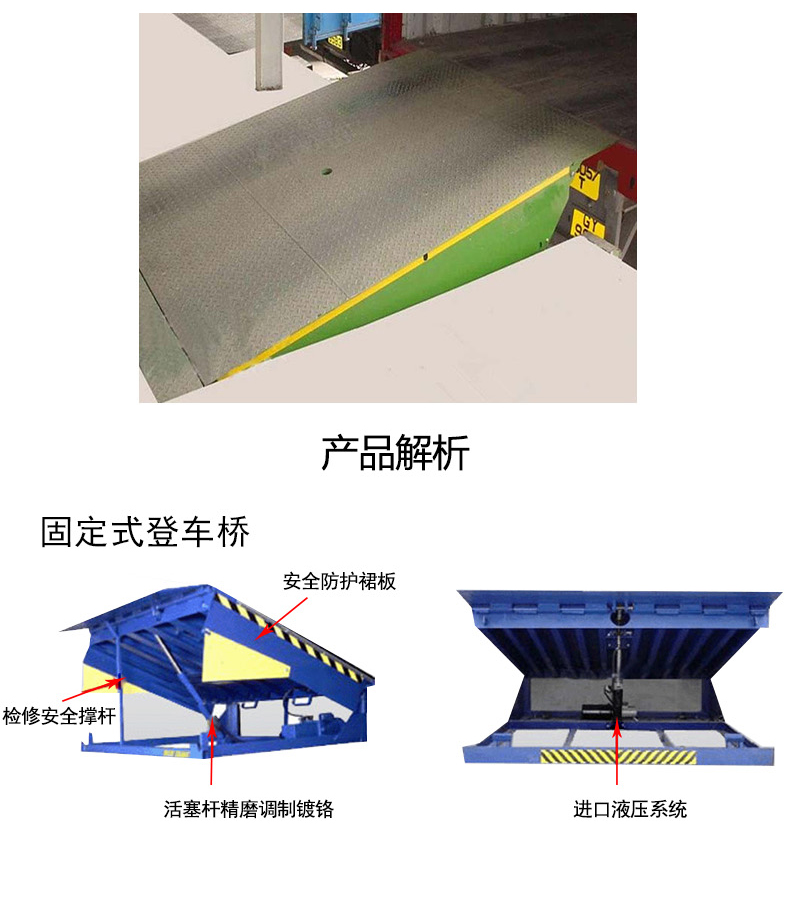 固定式登車橋是一種安裝在庫(kù)房月臺(tái)上的裝卸輔助設(shè)備,它不工作時(shí)與月臺(tái)地面平齊,裝卸作業(yè)時(shí)可根據(jù)貨車車廂的高度進(jìn)行調(diào)節(jié)登車橋的高度,使貨車與倉(cāng)儲(chǔ)的貨臺(tái)之間架起一座橋梁,叉車等搬運(yùn)車輛通過(guò)它能直接駛?cè)胴涇噧?nèi)部進(jìn)行貨物的批量裝卸作業(yè),僅需單人作業(yè),即可實(shí)現(xiàn)貨物的快速裝卸。固定式登車橋使企業(yè)減少大量勞力,提高工作效率,獲取更大經(jīng)濟(jì)效益。