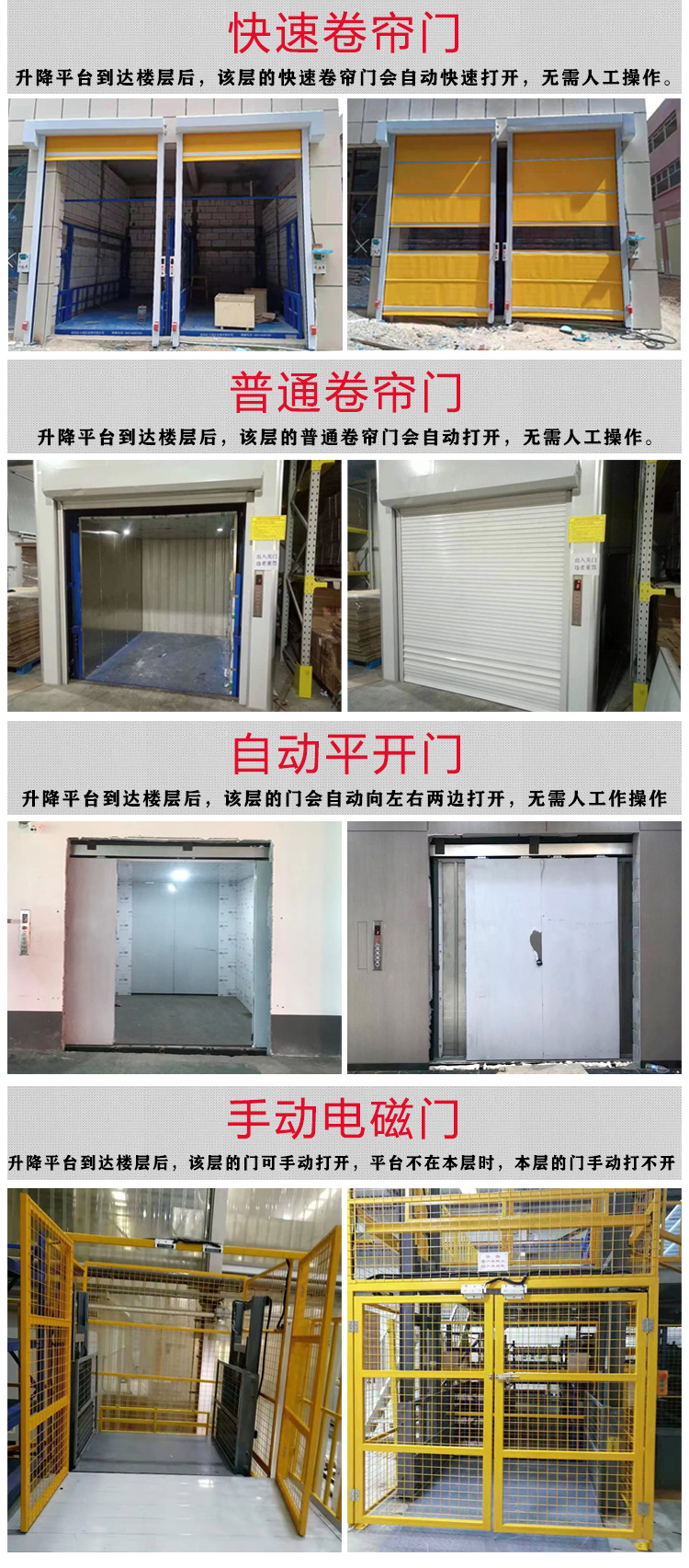 液壓升降貨梯設(shè)定防墜、上下層門互動,各樓層都安裝數(shù)字顯示操作按鍵。層門可全線貫通,工業(yè)廠房內(nèi)外可互相戳開,便捷、節(jié)約室內(nèi)空間,層門的選擇有多樣性。根據(jù)客戶的預(yù)算和實用需求選擇適合的層門即可。